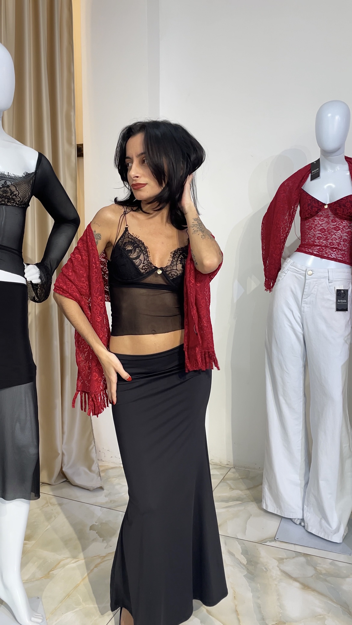 design Clé, feito com busto Renda de Noiva alta qualidade e durabilidade, acompanha forro no busto preto e aro meia-taça. Corpo feito com tecido de tule. Monte seu Look deixando-o mais elegante