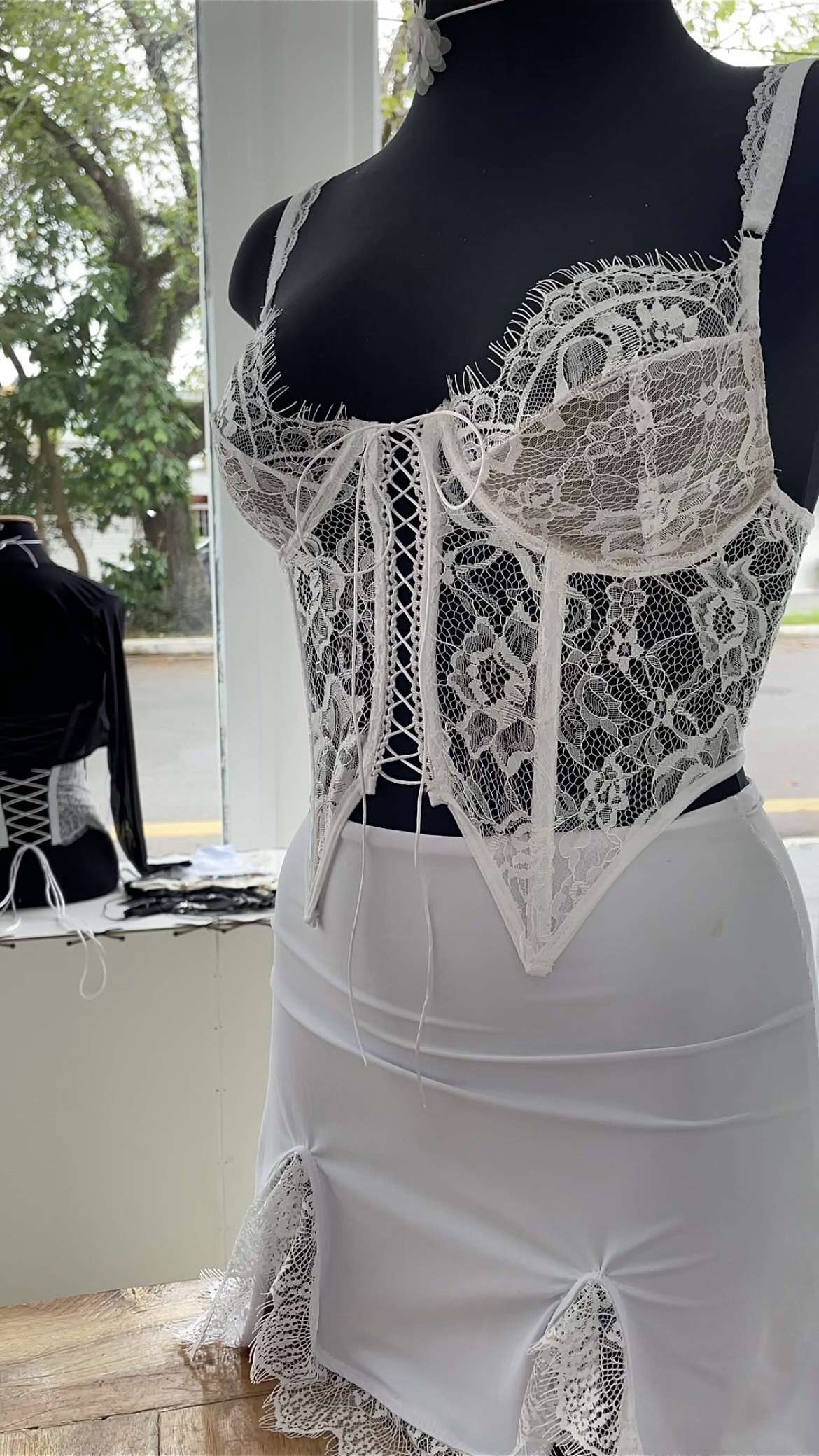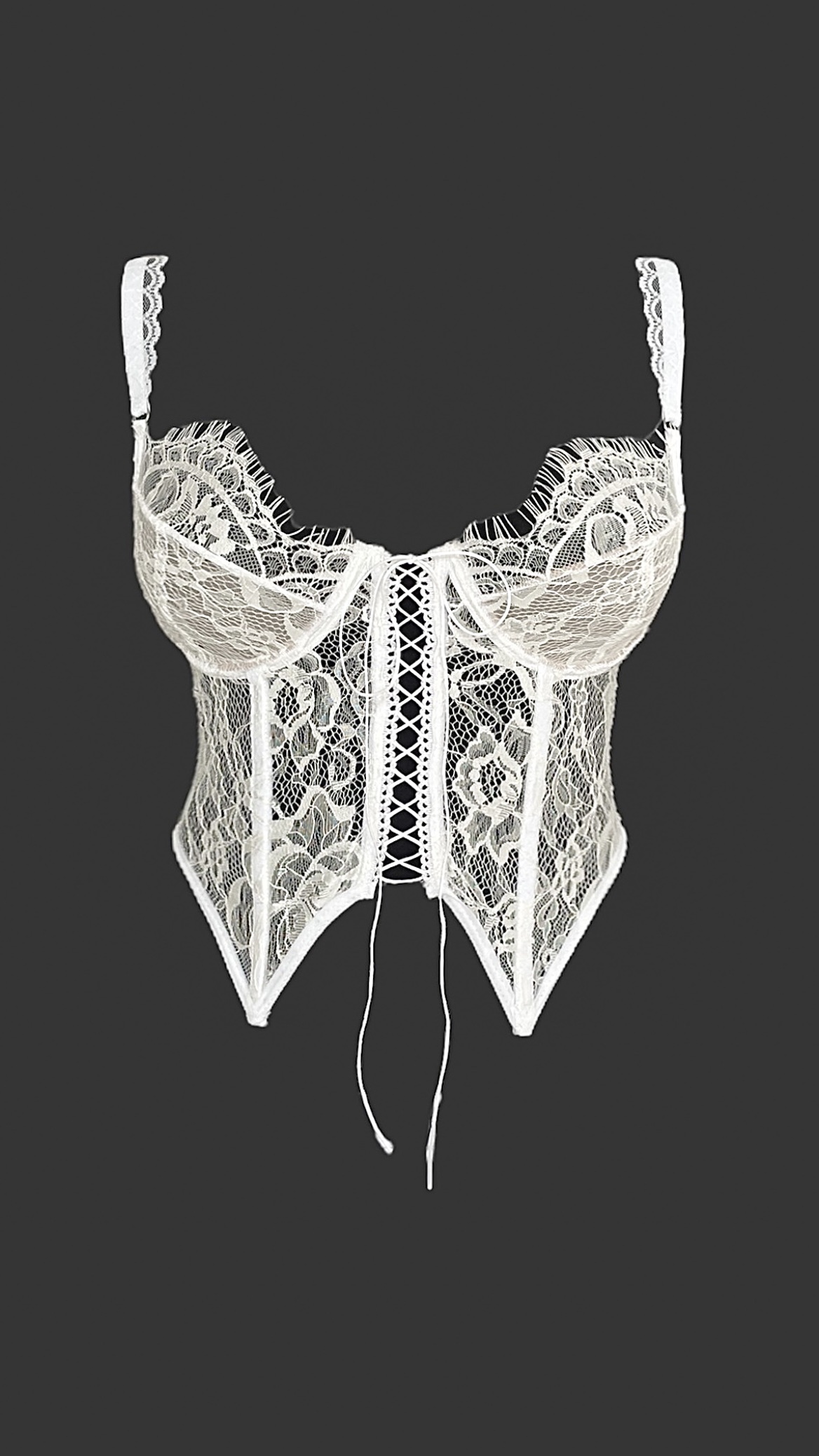 Design Eau, corset bem estruturado feito com barbatanas, e detalhe entrelaçado com fio de cetim na parte frontal, acompanha aro meia-taça. Não possui cinta-liga. Renda de alta qualidade que não possui elastano.