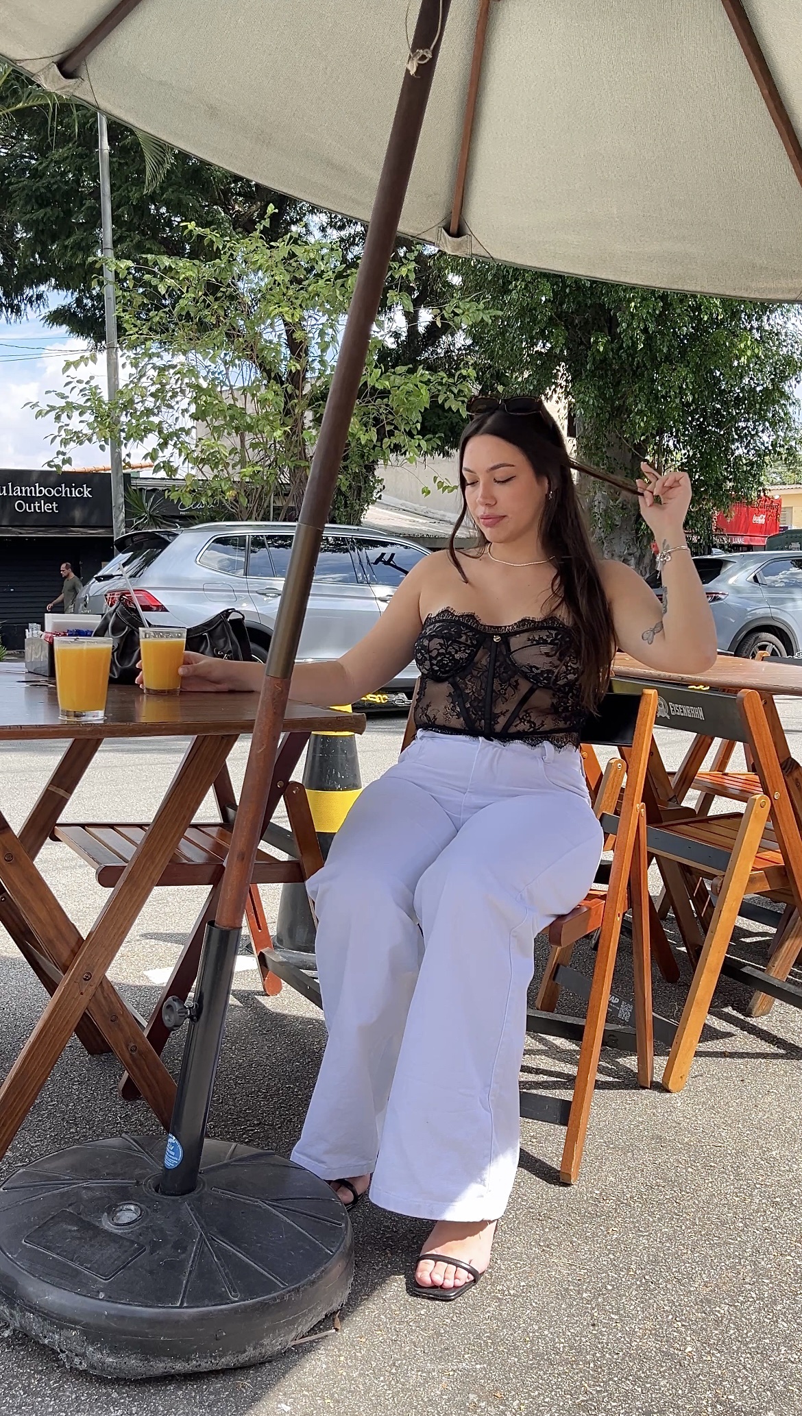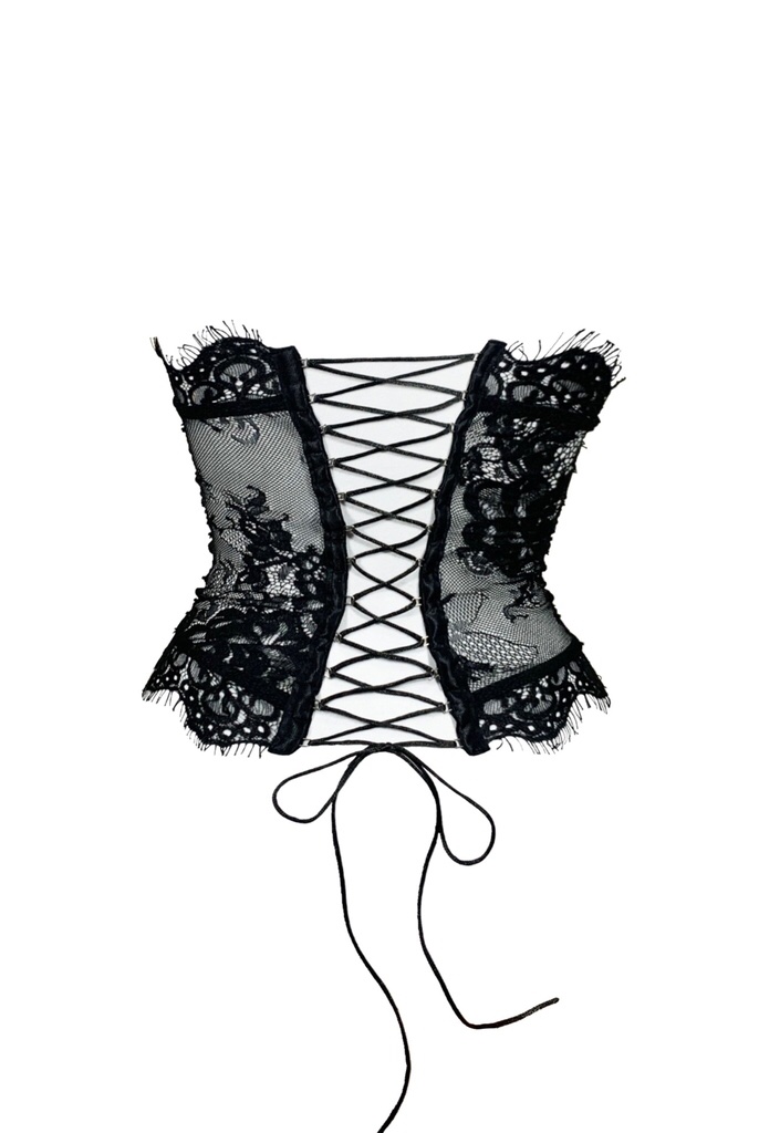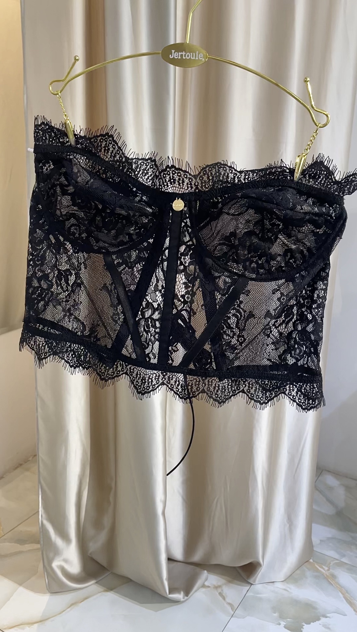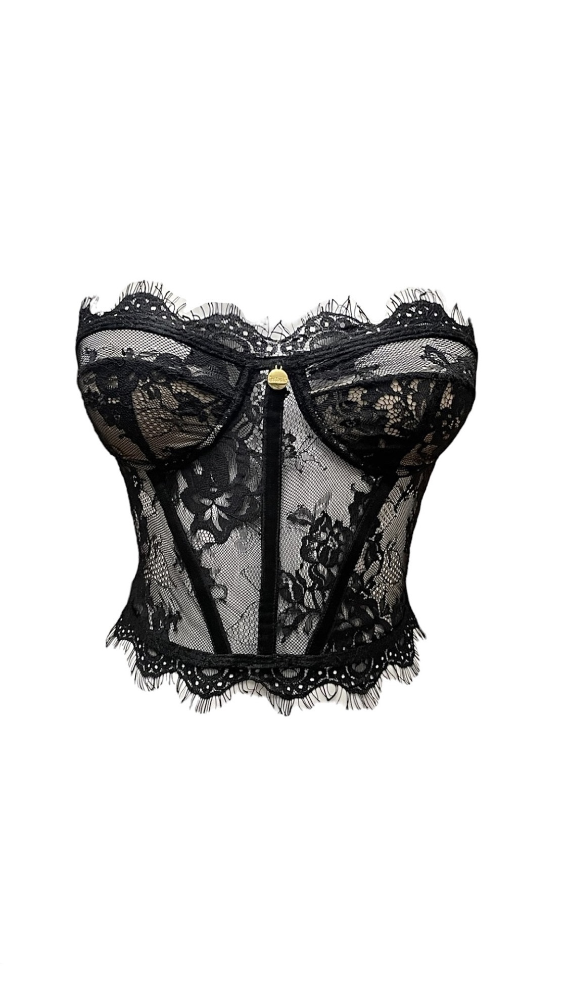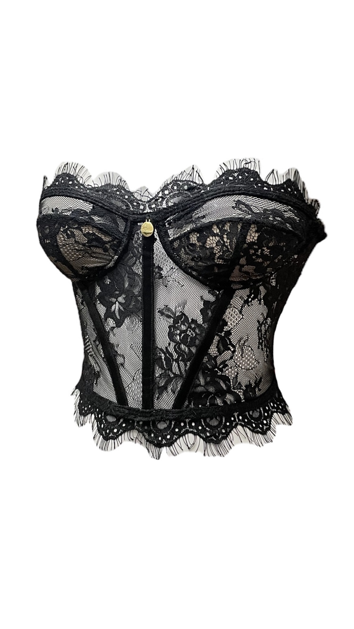 Design Labythe Fer, o Corset sem alças, feito com barbatanas. A renda não possui elastano, sustentando o busto. Acompanha aro meia-taça, e forro no busto bege sem transparência.