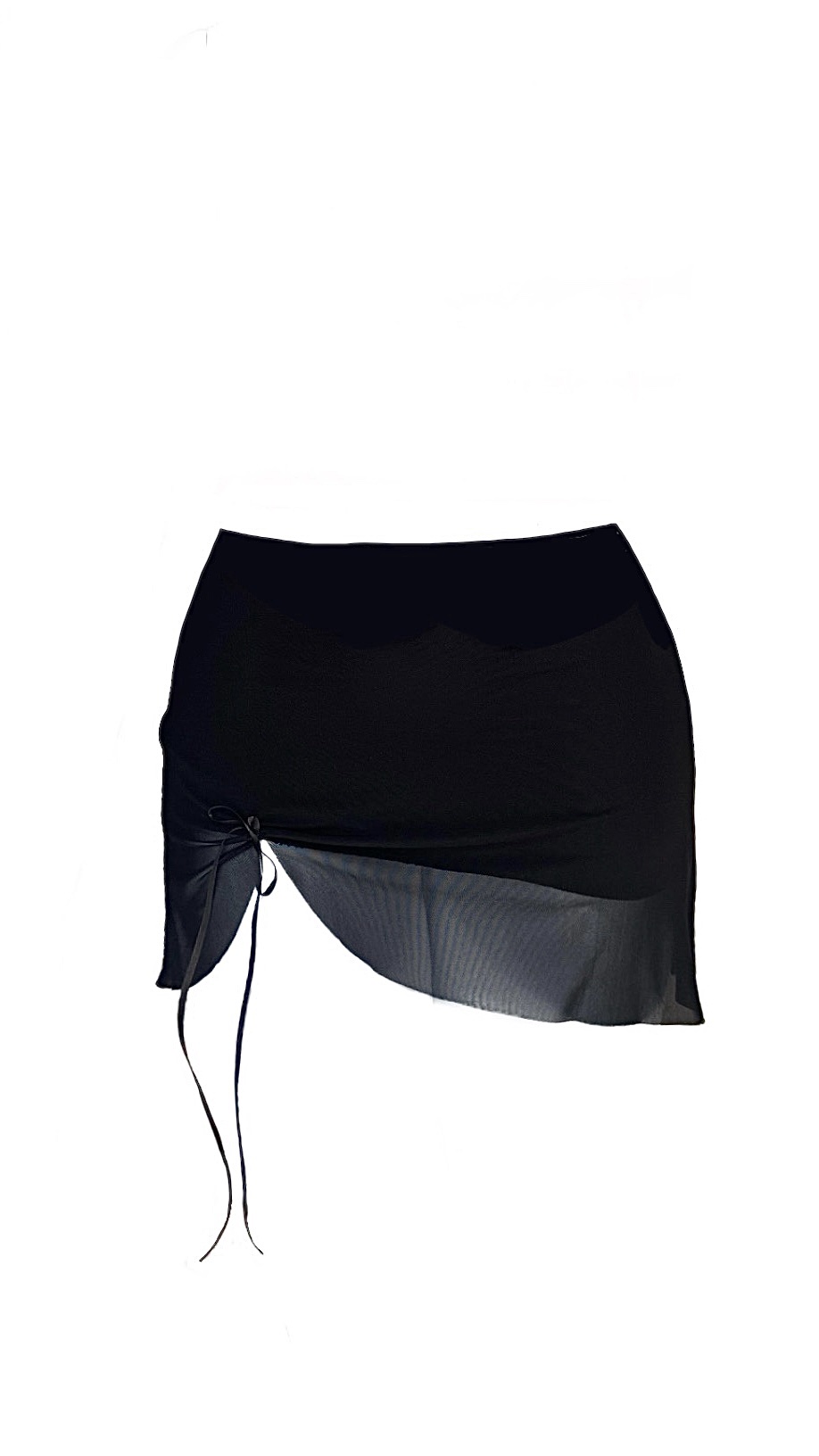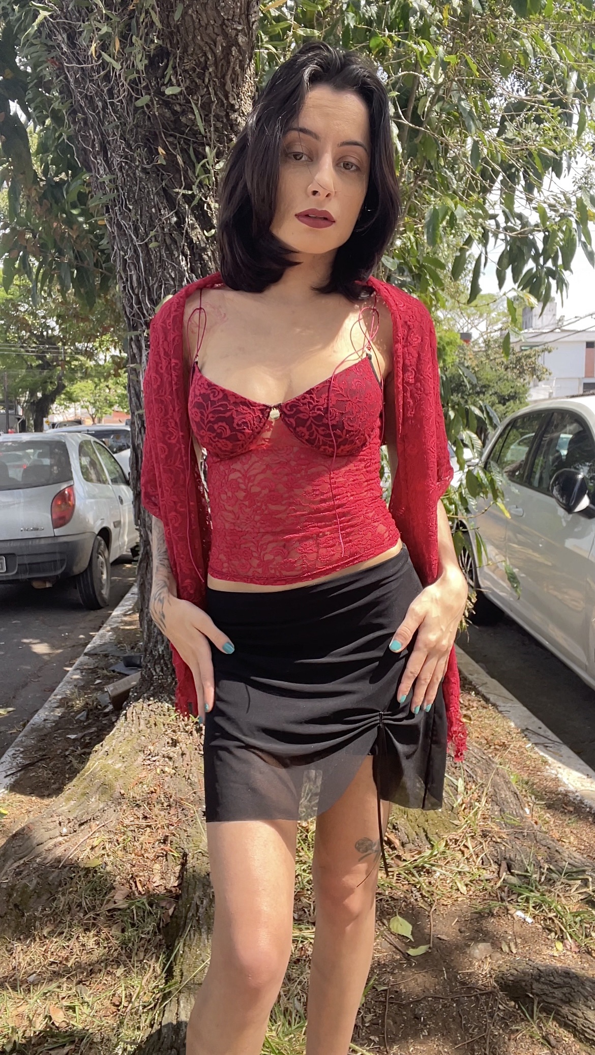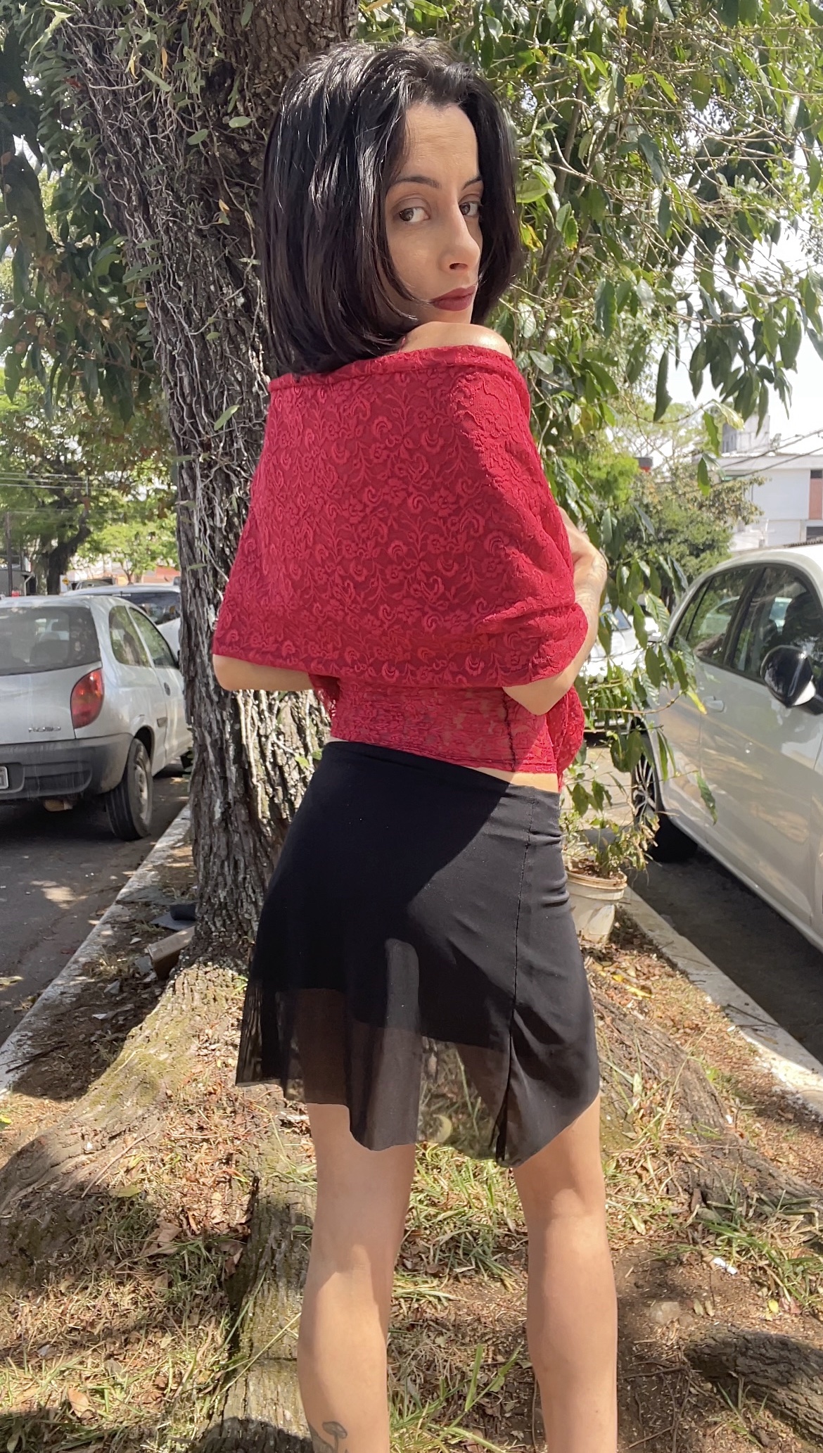 Blusa feita em tule poliamida com elastano e com aro meia-taça Busto sem transparência. A modelagem se amolda ao corpo sustentando o busto e as alças de cordões de amarração ajudam a dar um “up” no busto. Saia midi em tule de poliamida e forro interno em microfibra poliamida.
