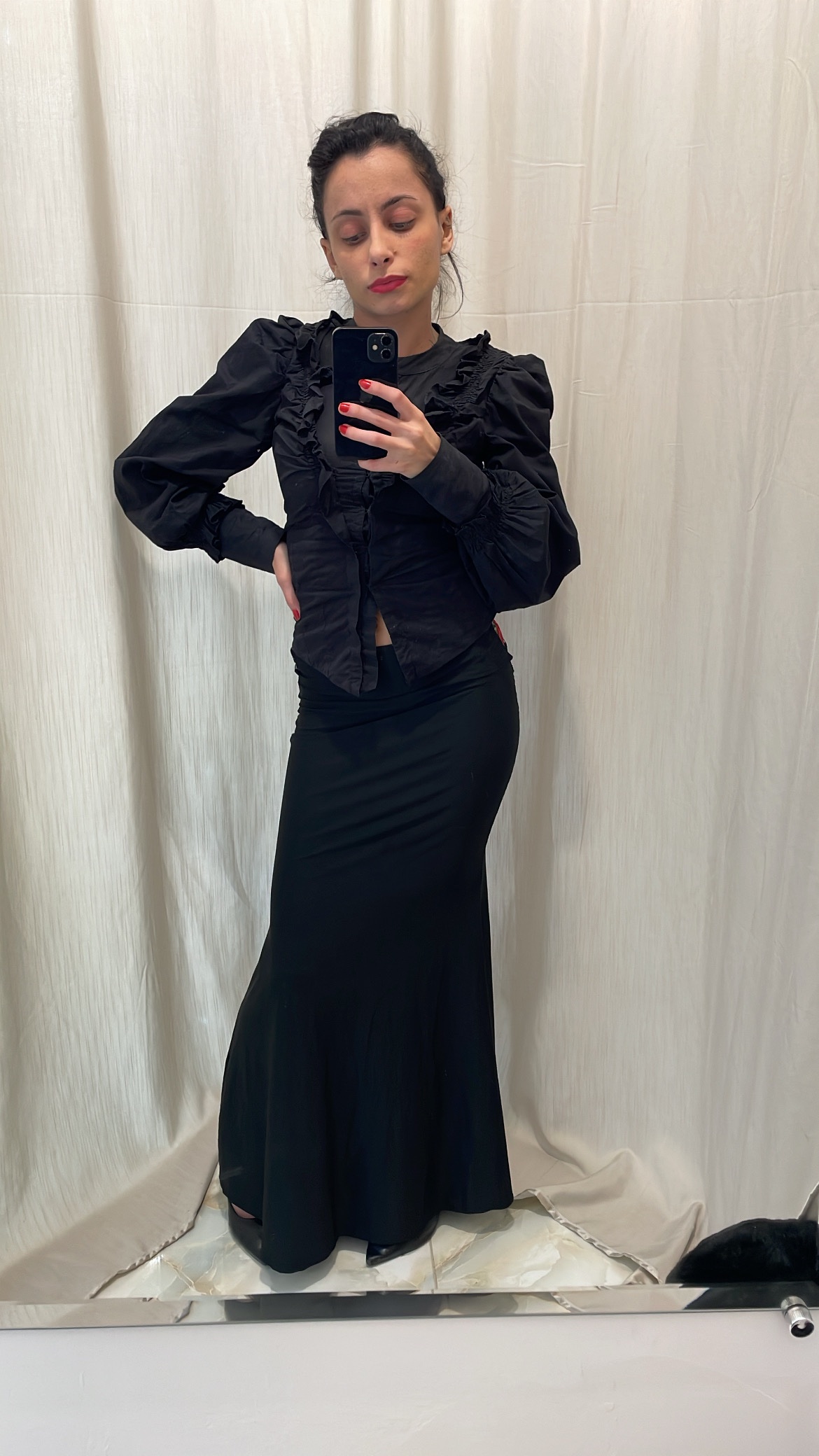 Blusa feita em tule poliamida com elastano e com aro meia-taça Busto sem transparência. A modelagem se amolda ao corpo sustentando o busto e as alças de cordões de amarração ajudam a dar um “up” no busto. Saia midi em tule de poliamida e forro interno em microfibra poliamida.