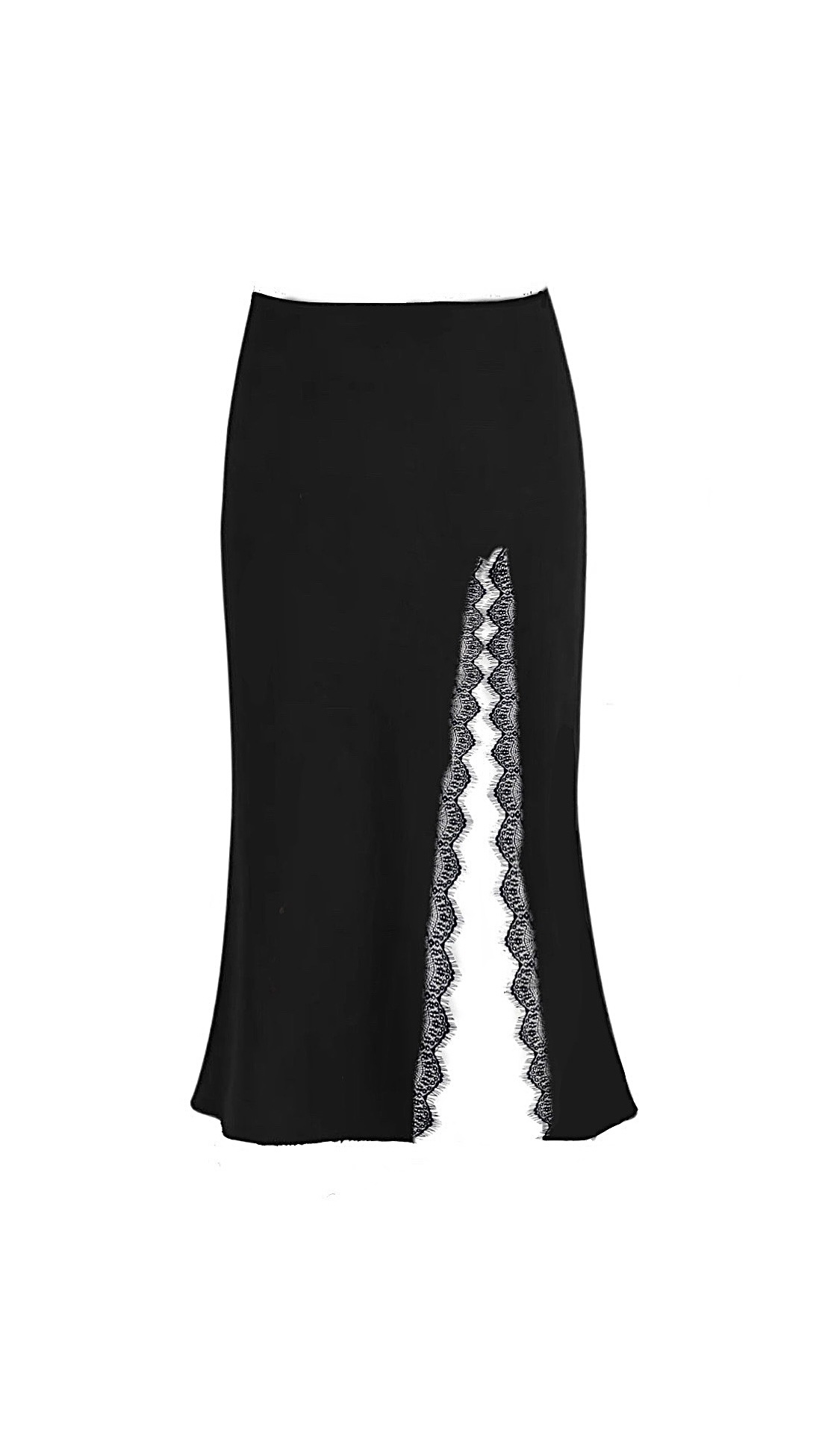 Design Midi Geoire, pode ser usada de cintura baixa e média, modelagem colada na região do quadril e solta no final do caimento. Fenda com Renda de Noiva, tecido microfibra com poliamida com elastano